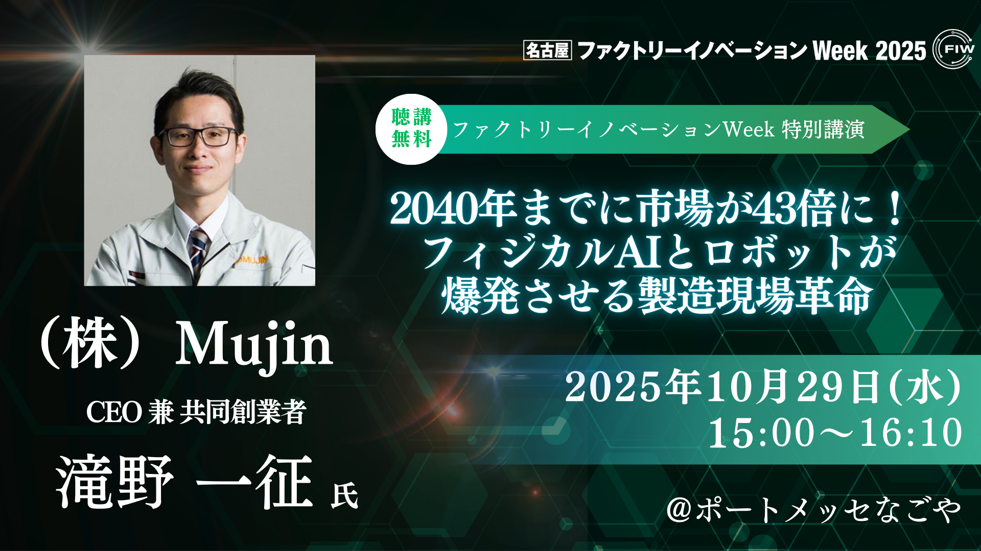 10月29日(水)~31日(金)にポートメッセなごやで開催される製造業の最新トレンドを網羅した展示会「ファクトリーイノベーションWeek」にて、MujinのCEO 兼 共同創業者である滝野が登壇し、講演を行います。