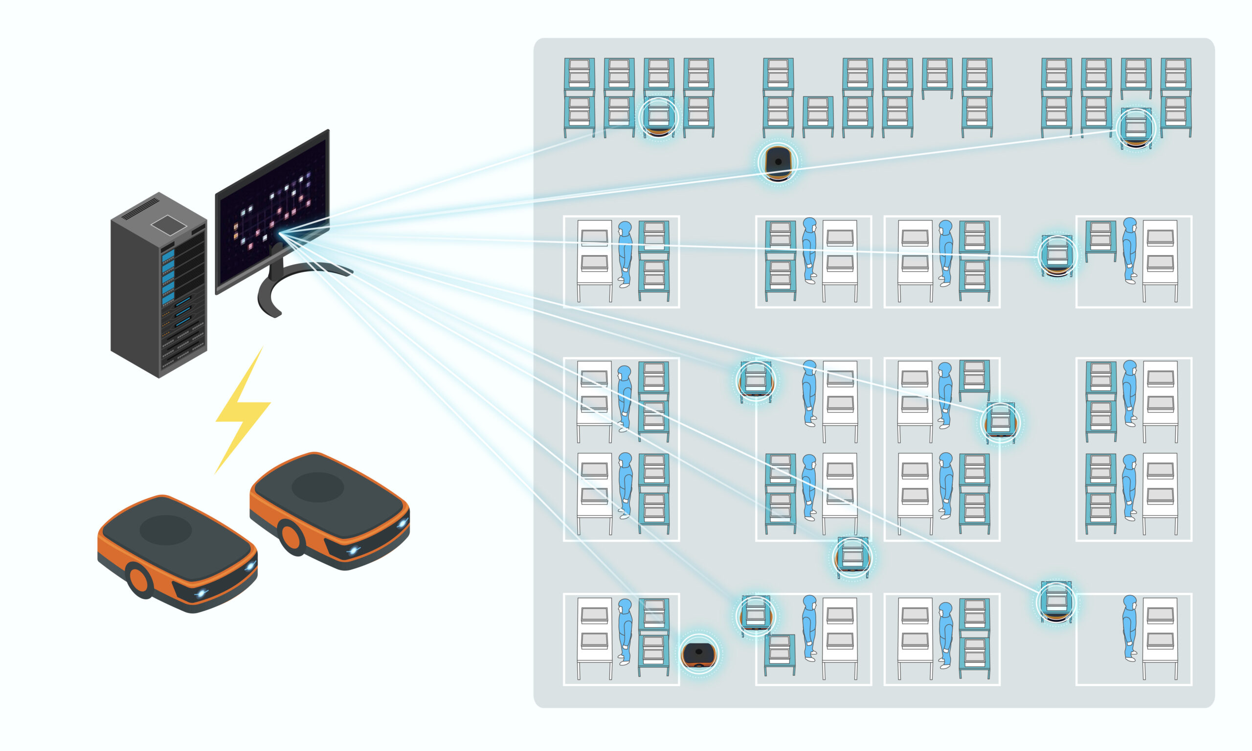 衝突・渋滞回避をソフトウェアが自動的に制御することで、複数台のAGVが走行する現場でも搬送能力を最大化します。