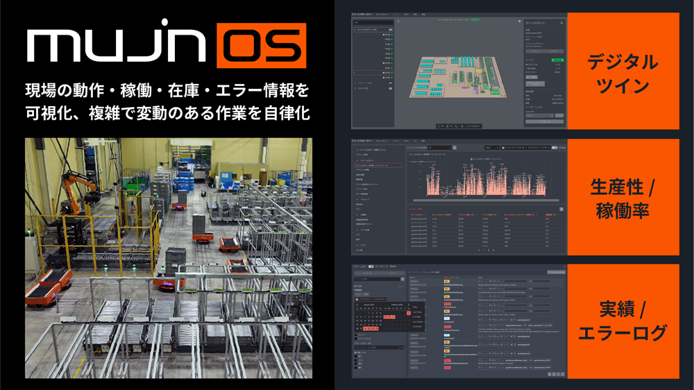 MujinOSは、ロボット・AGV・保管システム、ビジョンセンサ等の多様な自動機器をデジタルツイン環境で統合制御する統合型オートメーションプラットフォームです。単なる見える化ツールとは異なり、独自のフィジカルAI x デジタルツイン技術により、現場で起きる動作・稼働状況・在庫・エラーなどのあらゆるデータをリアルタイムで吸い上げ、その生データを基に“止まらない・最適な運用”のための改善や経営判断を可能にしています。ティーチング不要、動的最適化、データ分析・リモート運用までをも可能にし、産業現場のDXを支援しています。詳細はこちらをご確認ください。