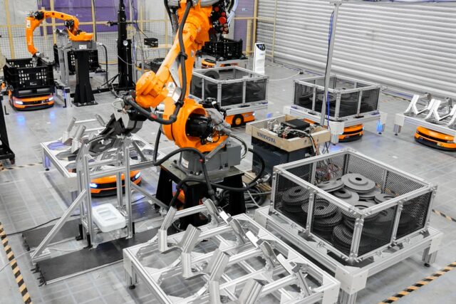 例えば、自動車業界においては、EV化が進むことで参入企業が増加し、変種変量生産が求められるようになり、以前のような大量生産向けの「専用ライン設備」ではなく、柔軟な対応が可能なロボットとAGVを統合的に制御する「知能ロボットセルシステム」への移行が加速しつつあります。すでにMujinでは物流現場で培った経験を製造現場へ応用することで、工場においても、数十台の知能ロボットとAGVを組み合わせた、次世代知能ロボットセル生産システムを提供しております。