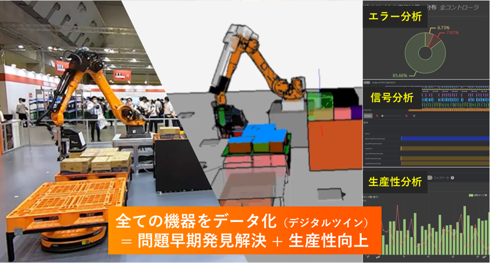 従来のようなロボット、カメラ、センサ、AGVが全て異なるコントローラで制御されているのではなく、Mujinコントローラプラットフォームで全体を制御することで、全ての動作、信号、状態をデジタルツイン上でリアルタイムに把握することができます。そのため、万が一のトラブル発生時も速やかに復旧対応および原因追及することが可能となり、更なる生産性向上に貢献します。