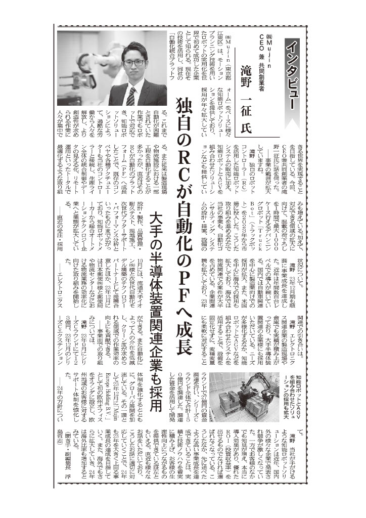 電子デバイス産業新聞に、MujinのCEO 兼 共同創業者である滝野のインタビュー記事が掲載されています。