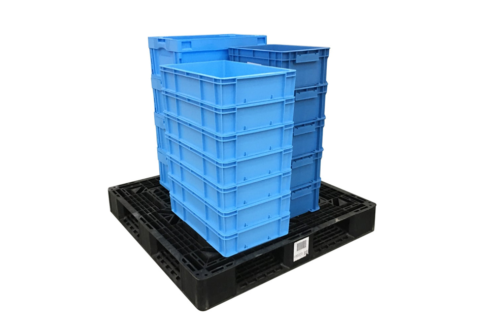通い箱の工程間物流を自動化。 複数品種(サイズ違い、蓋有り無し)の通い箱を搬送できる知能ロボットとAGVの連携により、他工程への部品供給の自動化を実現します。